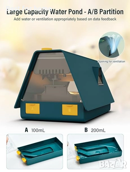 Функция за външно пълнене с вода: напълно автоматичният инкубатор има входове за вода A и B от външната страна, които могат да се използват за добавяне на вода без отваряне на капака, увеличават вентилацията за подобряване на скоростта на плъзгане и също така намаляват загубите на топлина. Външният дизайн на малката къщичка е и по-привлекателен за интереса на децата към излюпването на пилета.