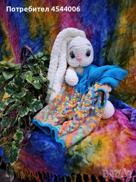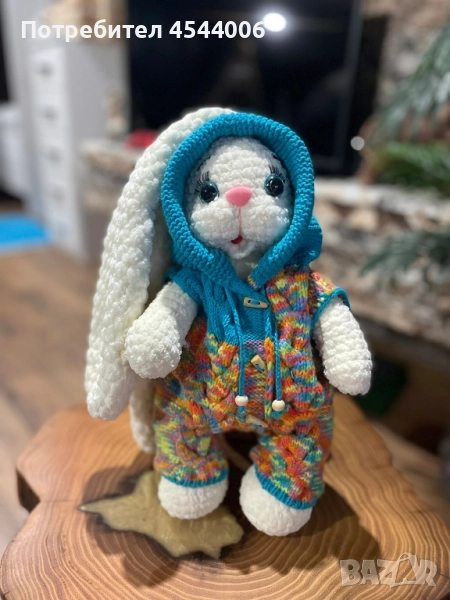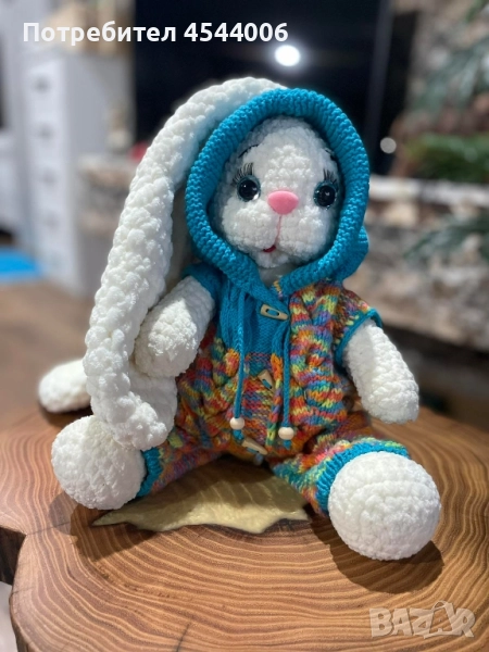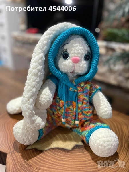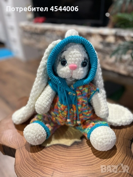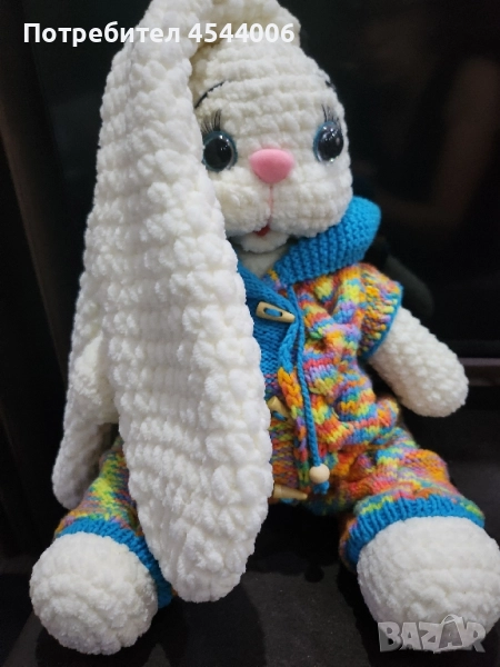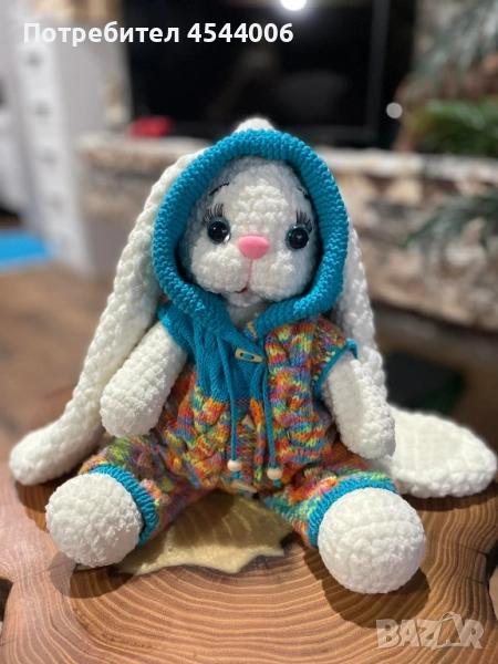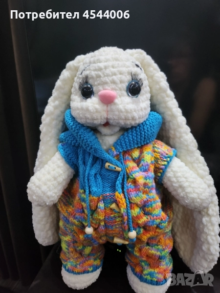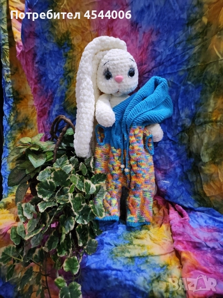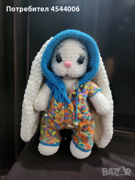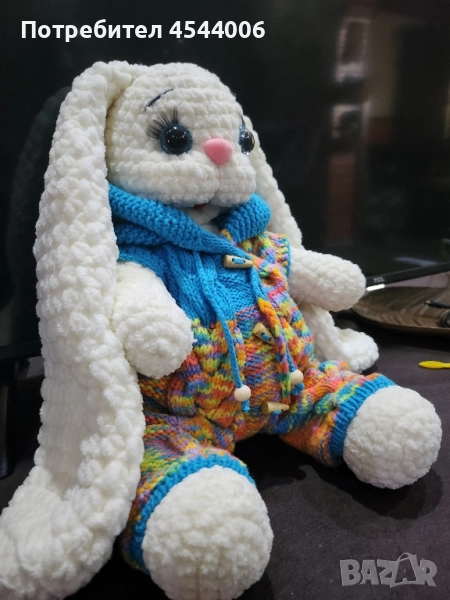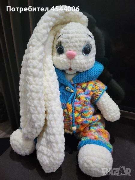 Изцяло ръчна изработка,плюшена прежда,силиконов пълнеж .Височина -38см.без ушите.Дължина на ушите-35см. Гащиризона се сваля.