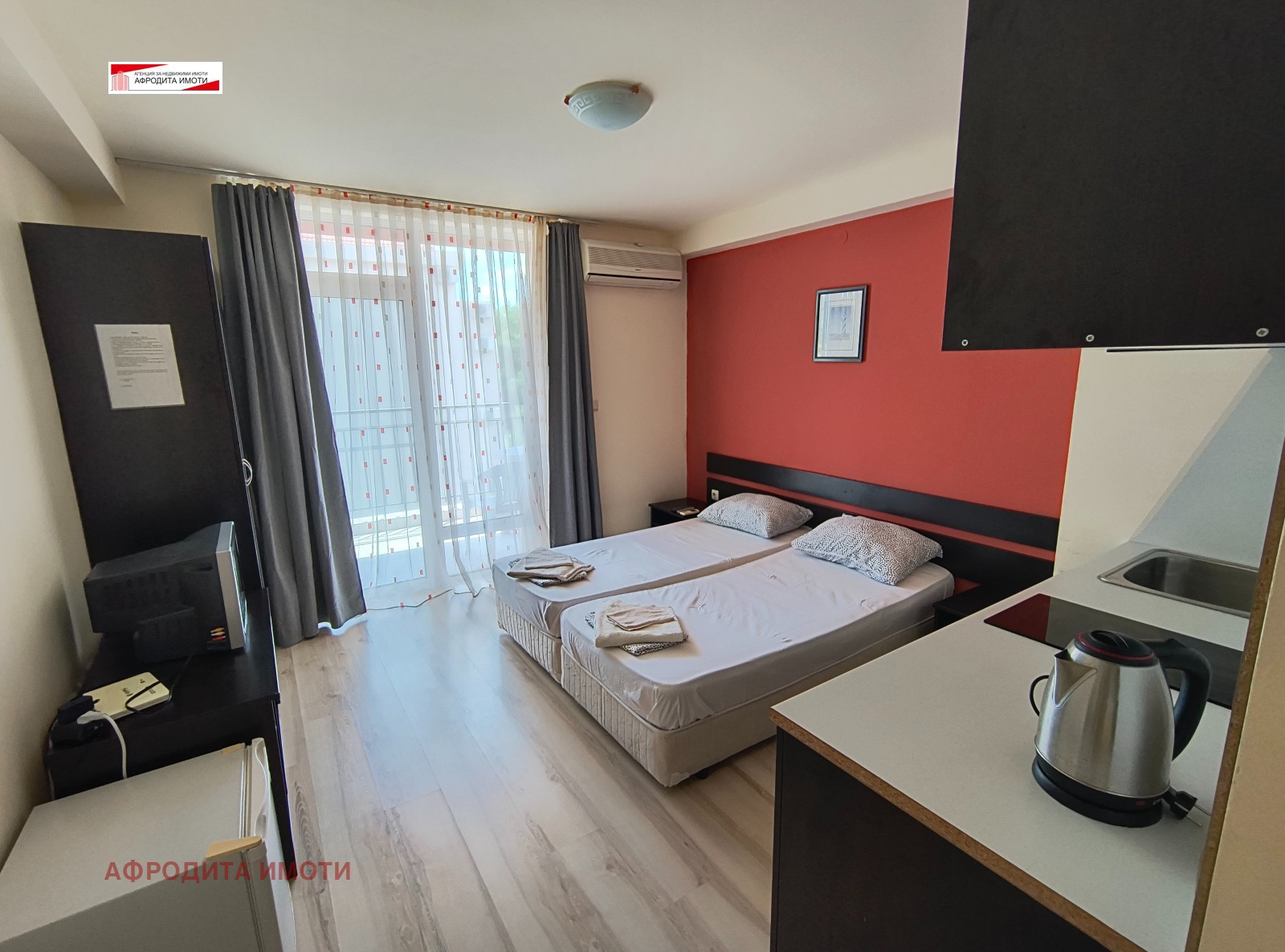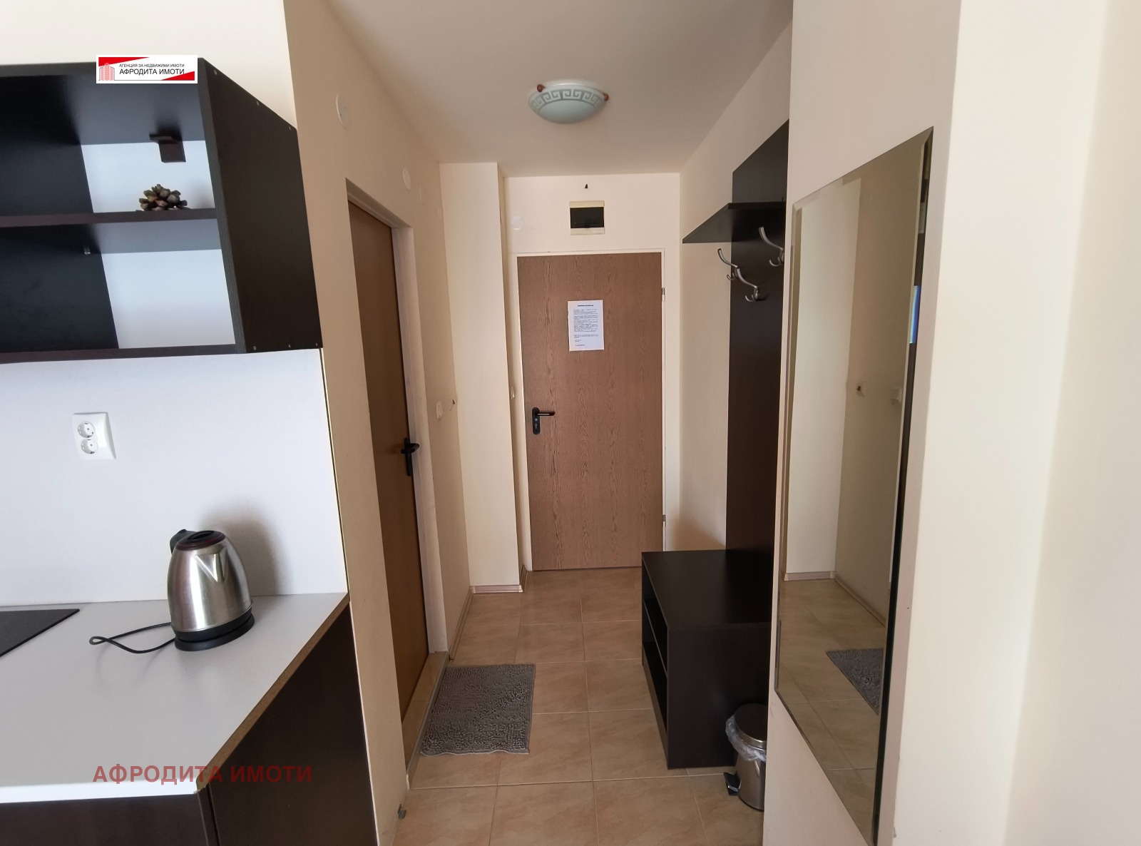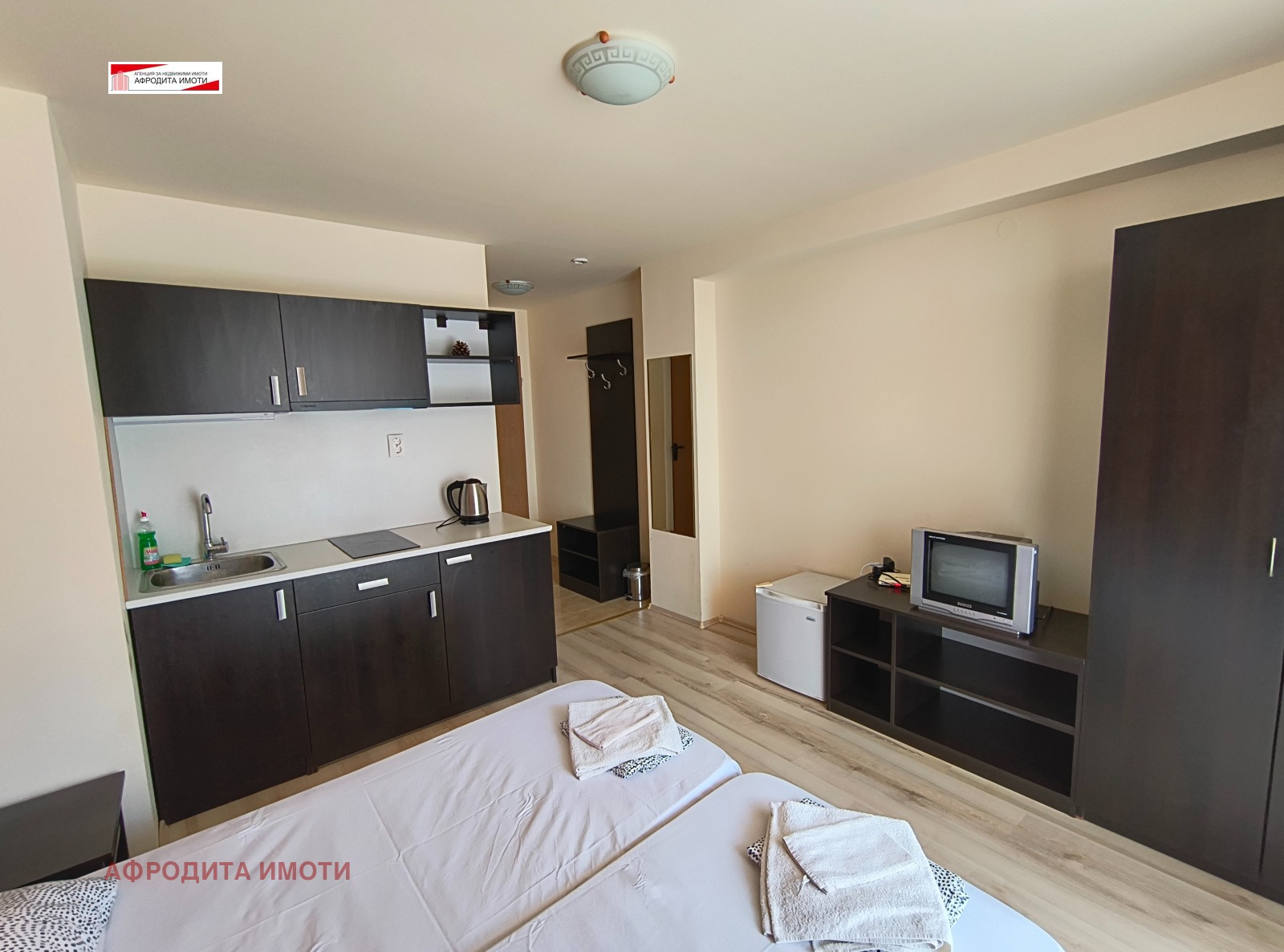 Предлагам студио за продажба в комплекс Афродита 1. Имотът се намира на 4ти етаж от 5 и има площ 33 кв. м. Изложението му е източно. Състои се от коридор, една голяма стая с кухненски кът, баня с тоалетна и тераса.