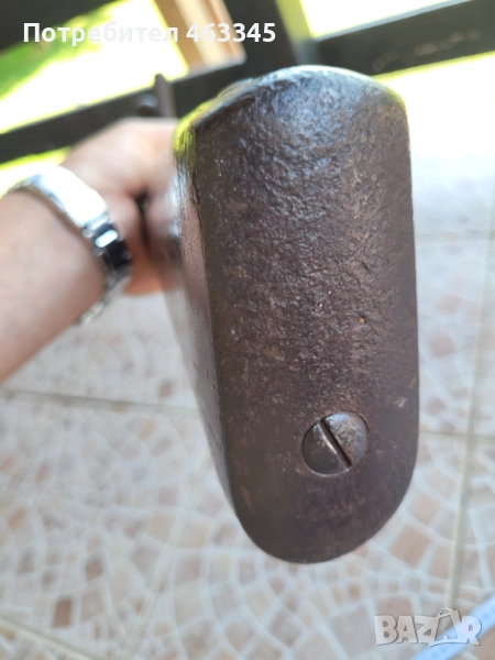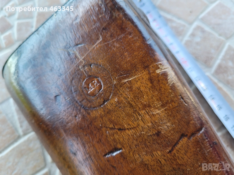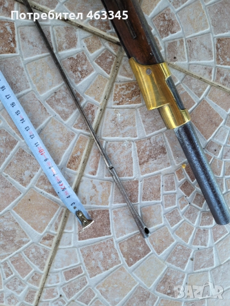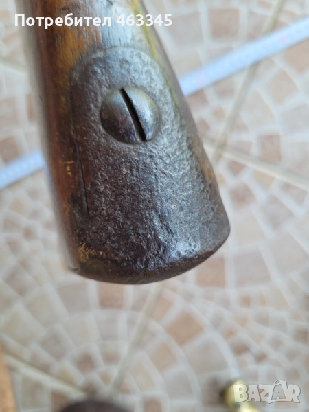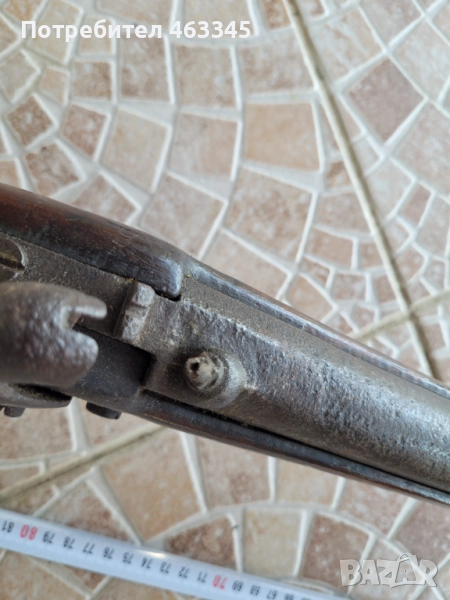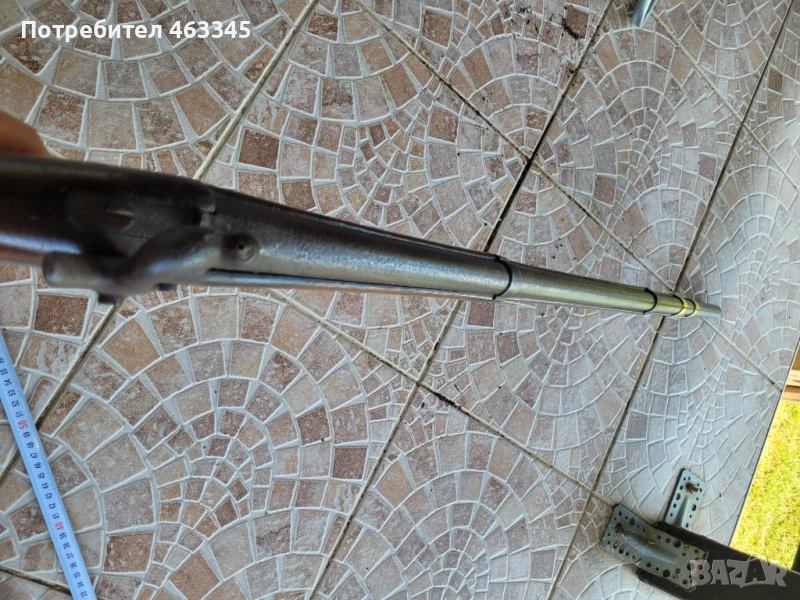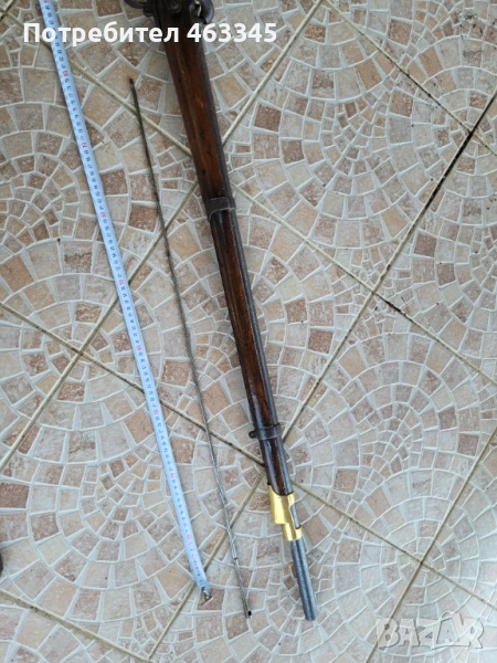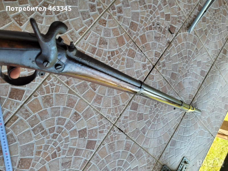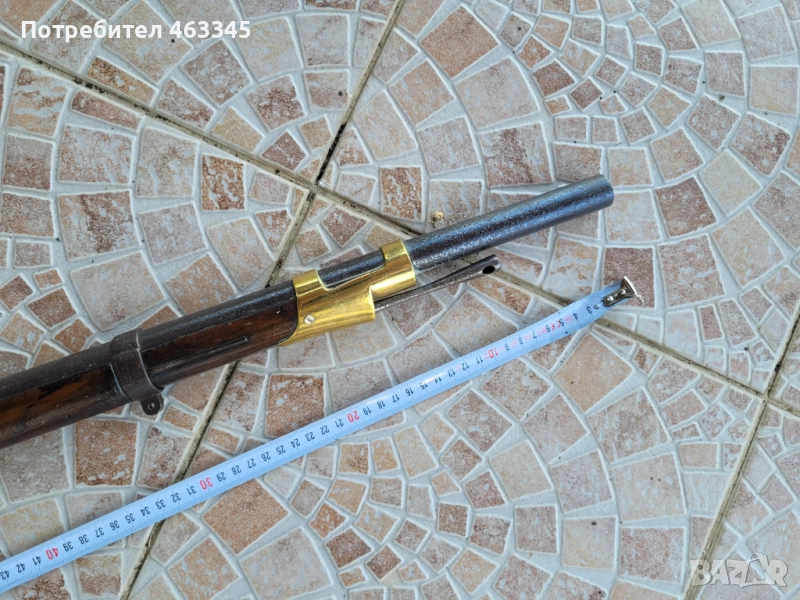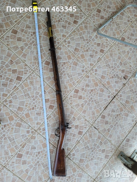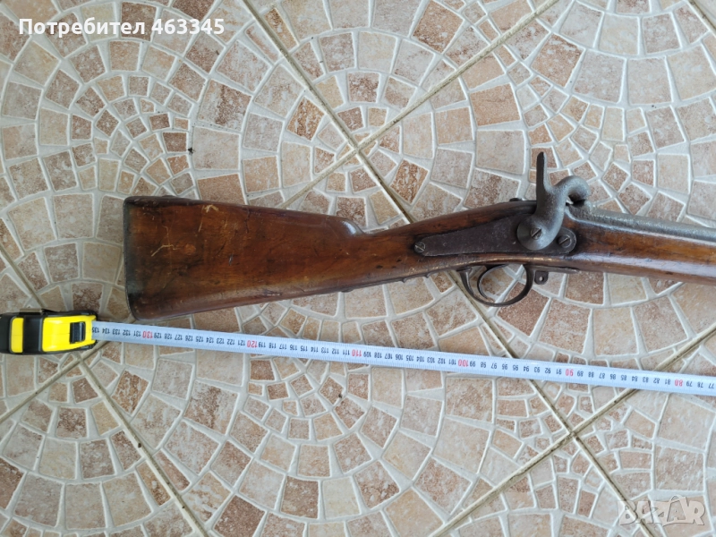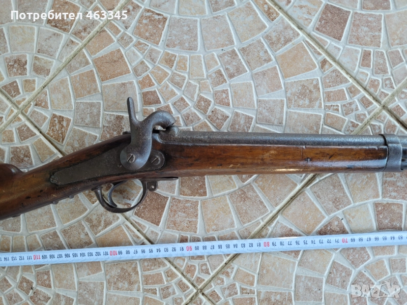 Руска пехотна, перкусионна пушка от времето на Кримската война, пленена от англичаните край Севастопол и маркирана от тях по приклада в последствие. Дървенията е в изрядно състояние, без дървояд, наранено или отчупено. Железните части са прокрити с много дебела патина и ръжда. Наличен оригинален шомпол. Механизмът работи перфектно, петлето запъва и в двете положения и спуска със силна бойна пружина. Пали евзито от всеки път. Пистонът е в прилично състояние и има още много хляб в него. Цевта е проходима, без запушвания. Отличен колекционерски екземпляр, непочистван, нереставриран, 100% оригинал.