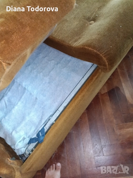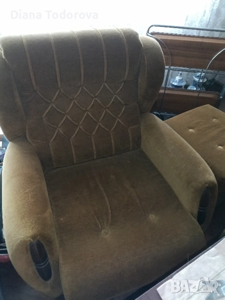 гарнитурата закупена през 1984г.много е запазена, като нова ,с два фотьойла и две табуретки.Разтяга се и става спалня,с забележка в пружините,като се разпъне от едната страна пада леко рамката на долу.Само лично вземане за Варна
