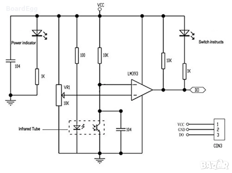 Модулът използва двойка инфрачервени диоди – излъчвател и приемник. При наличие на препятствие пред сензора, инфрачервената светлина се отразява и се улавя от приемника. Сигналът се обработва от LM393 компаратор, което активира изхода и зелената LED индикация.