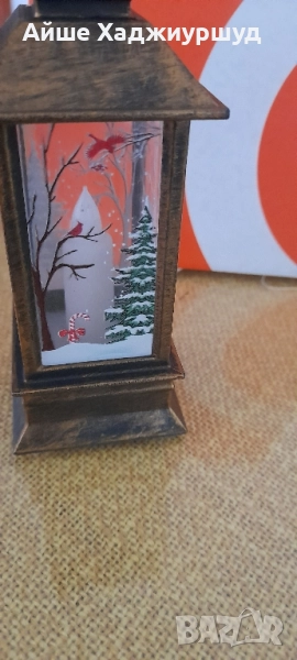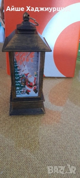 Светещ коледен фенер,с лед светлина, с включена батерия.Има кука за закачане. Размери, дължина 13см.ширина -5см.Материал-прастмаса.