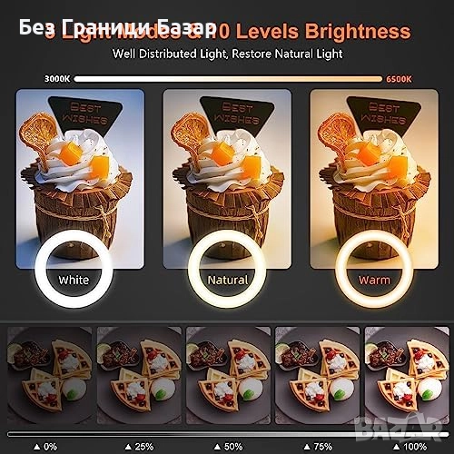 10-инчов пръстеновиден LED ринг с 3 цвята и 10 нива на яркост (3000K–6500K)