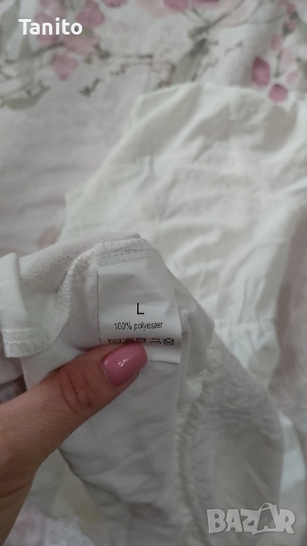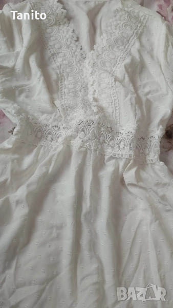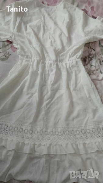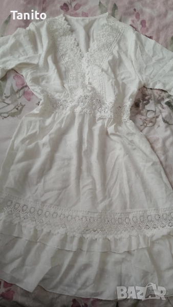 Нова красива бяла рокля,идеална както за летните дни, така и за специални поводи.Има елементи на дантела.Размер Л.
