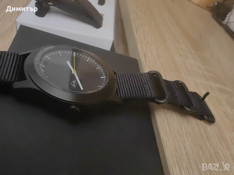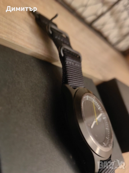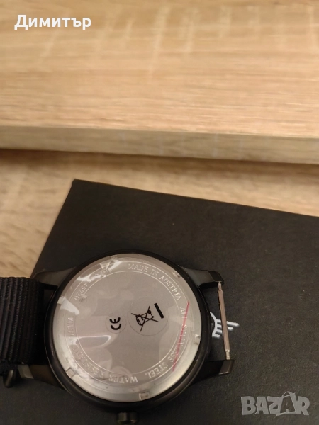 Основната каишка е от найлонова оплетка с Nato закопчаване, а допълнителната е от естествена кожа със същото закопчаване. Всичко по часовника е от неръждаема стомана и 100 м водоустойчивост.