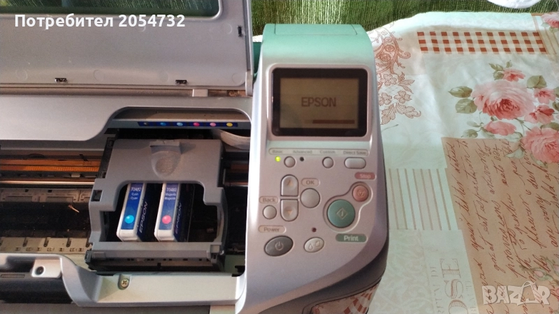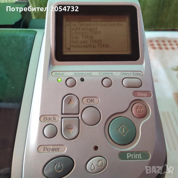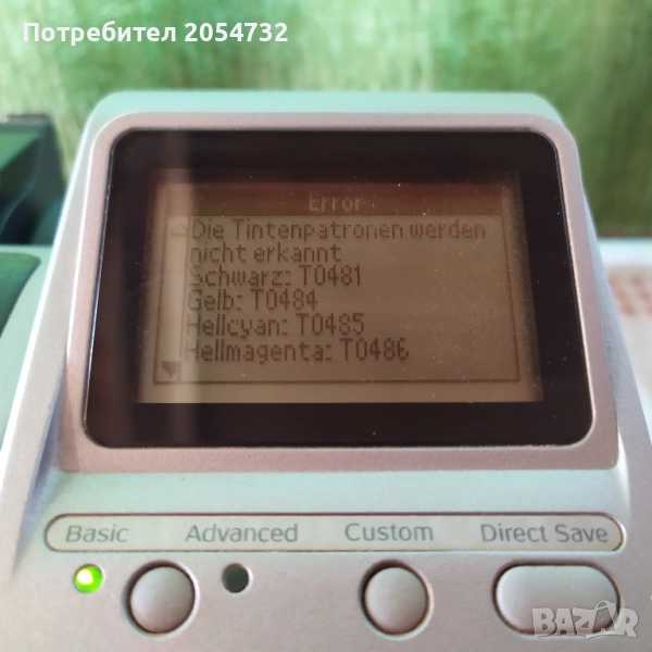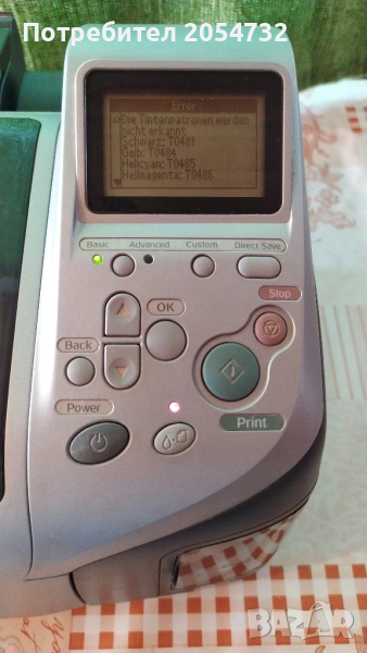 Фотопринтерът се включва, но не може да се приведе в действие. Както се вижда на снимките има липсващи мастилници. След като се включи на дисплея му се изписват грешки, които съм ги снимал.