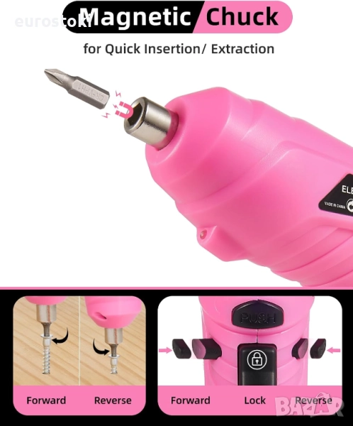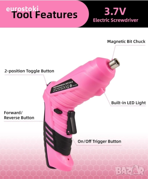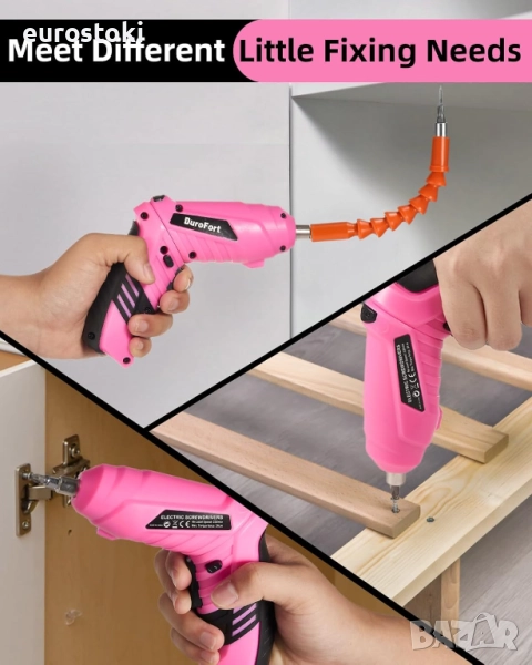 Durofort Комплект електрическа акумулаторна 3.7V малка отвертка в розов цвят, бормашина с 48 броя битове за отвертка, мощна 3Nm отвертка с 2 позиции дръжка, гъвкав вал LED светлина, не само за жени.