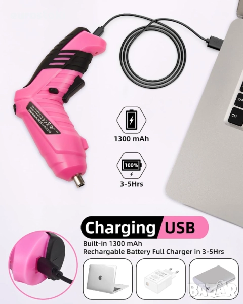 Захранване, когато ви е необходимо: Оборудван с батерия с висок капацитет 1300mAh, този автоматичен електрически инструмент с отвертка и безжична бормашина ви гарантира, че можете да се справяте с задачи без прекъсвания, като батерията може да се зареди напълно в рамките на 3-5 часа. Край на времето за престой в търсене на резервни части! В противен случай можете да зареждате, като свържете устройството към USB порта за зареждане чрез зарядно устройство, Power Bank и др.