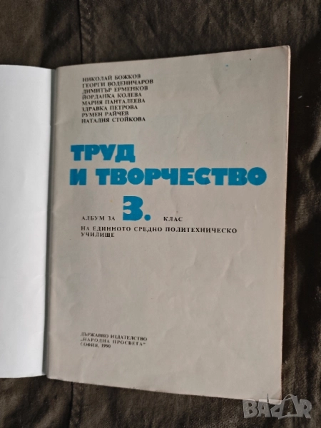 Продавам учебник " Труд и творчество за 3. клас" от 1990 г.,63 стр.Добре запазен с малки забележки на корицата , едно петно в съдържанието, име в края и на първата корица. Няма драскано