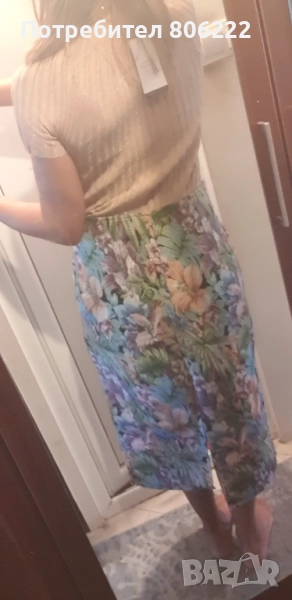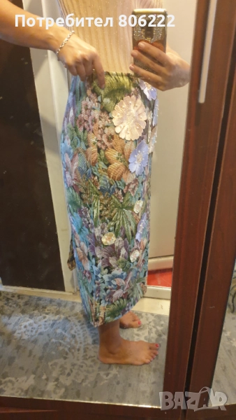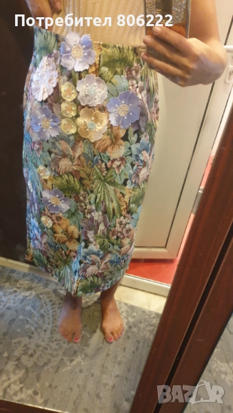 Полата е нова, но ми е голяма, аз нося М и съм с талия 80, ханш 100, а тази е Л. Платът е плътен, за есента. Цветята са апликация и са много ефектни.