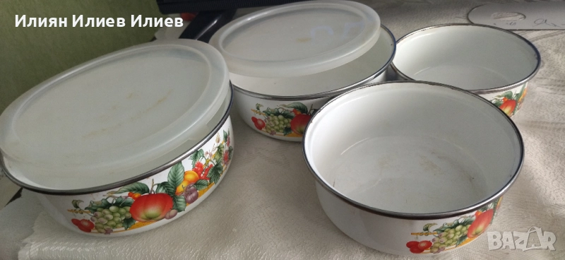 Комплект 4 метални съда, 15 евро; 18,5см; 17см; 14,5см, 12см; Височина от 6,5см до 4,5см; Пластмасови капаци – 2 бр. Съдовете могат да се ползват за приготвяне или съхранение на храна! Прибират се един в друг.
