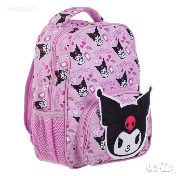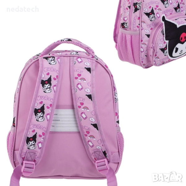 Ученическа раница за момичета, в лилав цвят, 2 отделения, с 1 голям джоб, 2 мрежести джоба отстрани за бутилка с вода и 3D Kuromi дизайн. Има езиче на гърба за детайлите на детето, здрави ципове, дръжка и регулируеми презрамки.