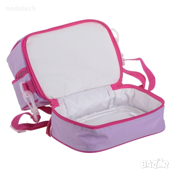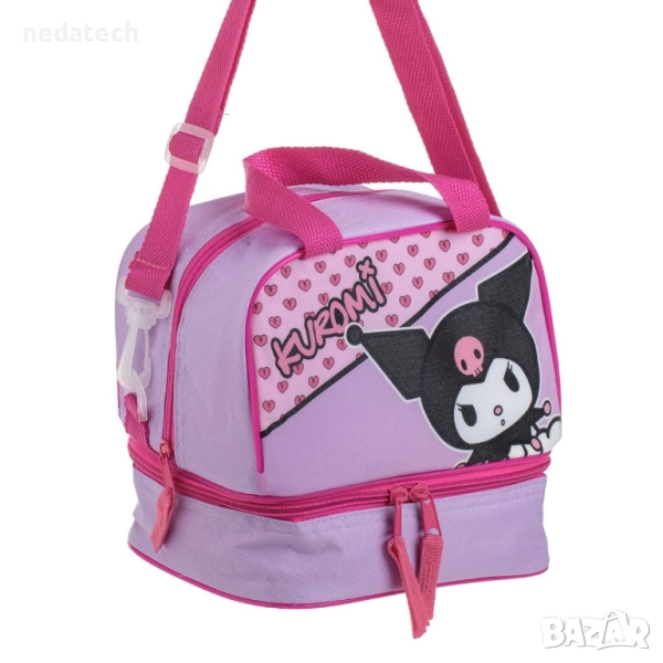 Изолирана чанта за обяд с брокатени мотиви на Куроми. Разполага с 2 отделения за детската храна, плодове или лека закуска и за кърпа или сок. Има дръжка и дълга презрамка за лесно носене.