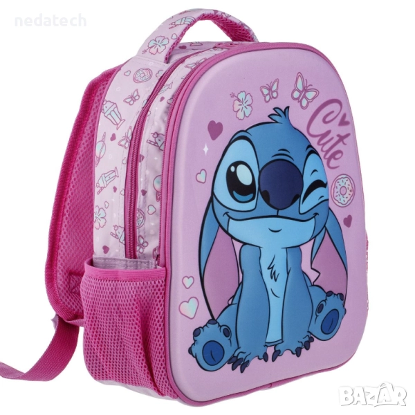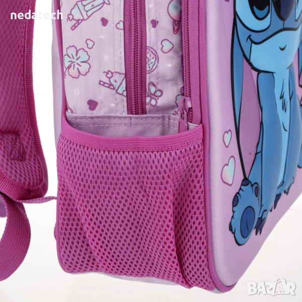 Раница за детска градина, в розово и синьо, 2 отделения, с 2 мрежести джоба отстрани за бутилка с вода и с 3D Stitch дизайн с пеперуди, сърца и принт "Сладък". Има мек гръб, дръжка, езиче за детските детайли на гърба, издръжливи ципове и регулируеми презрамки.