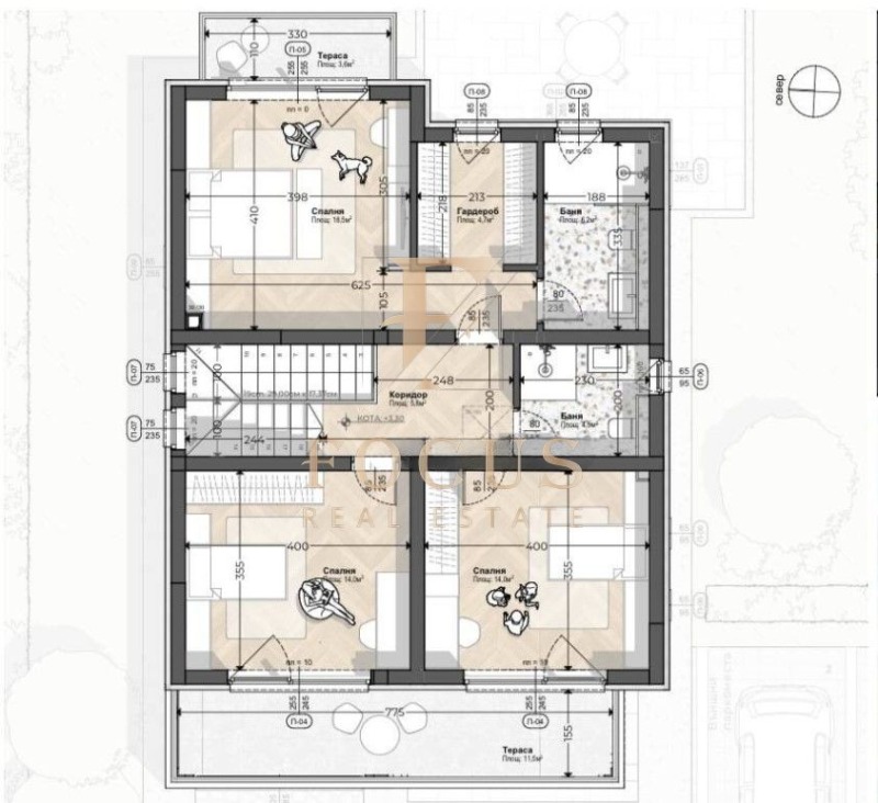 - втори етаж: коридор, три спални, две бани с тоалетни, дрешник и две тераси.