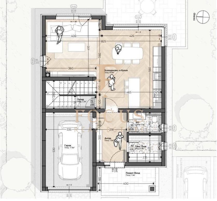Първи етаж: антре, просторна дневна с трапезария и кухненски бокс, баня с тоалетна, склад и гараж с топла връзка.