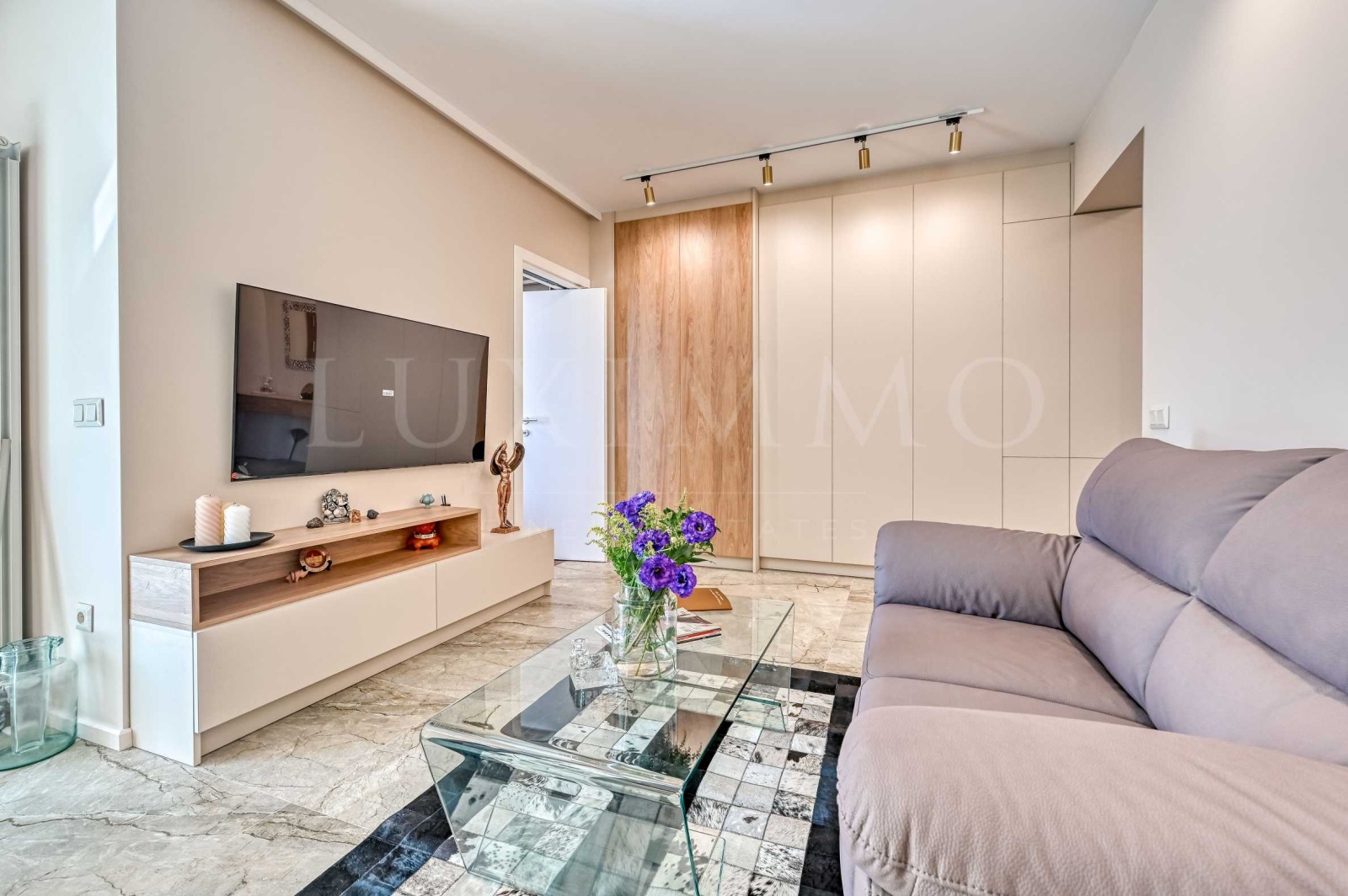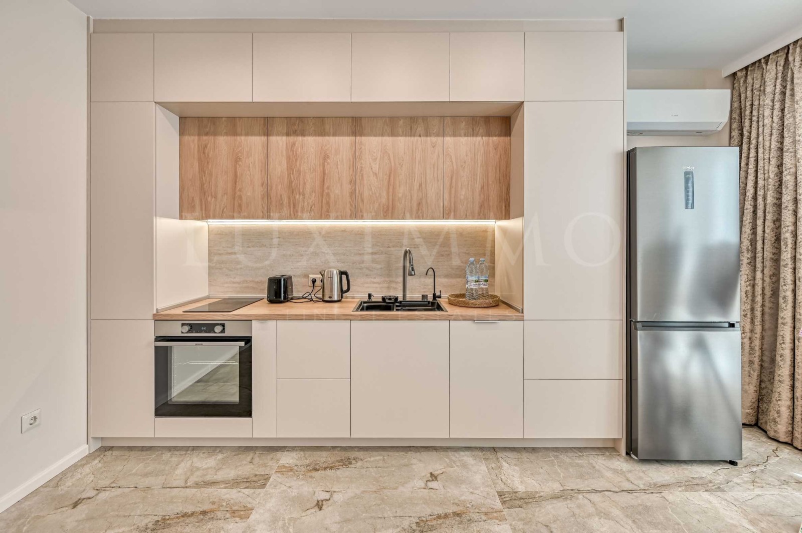 Просторна и светла всекидневна с кухненски бокс, оборудван с висок клас електроуреди (вградена фурна, котлони, абсорбатор, съдомиялна, хладилник );