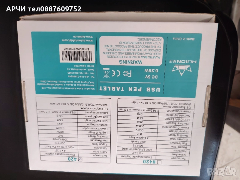 лаптоп или компютър с поне Windows 7 или поне MacOS 10.08 операционна система С чувствителност към натиск от 2048 нива графичният таблет Huion 420 осигурява гладки и фини чертожни линии и може да постигне впечатляваща графика или писане с много високо качество. Голямо предимство е цифровата писалка, която има форми на скорост на отчитане 200pps. Също много малкото тегло, само 167 грама и фактът, че е много тънка таблетка с малки размери, води до лесна употреба и лесен транспорт. Съдържание на пакета: Таблет 420 - 1бр MiniUSB към USB кабел - 1бр Писалка за батерия PEN 68 - 1 бр Резервации за писалки - 48 бр Ръководство за потребителя - 1 бр