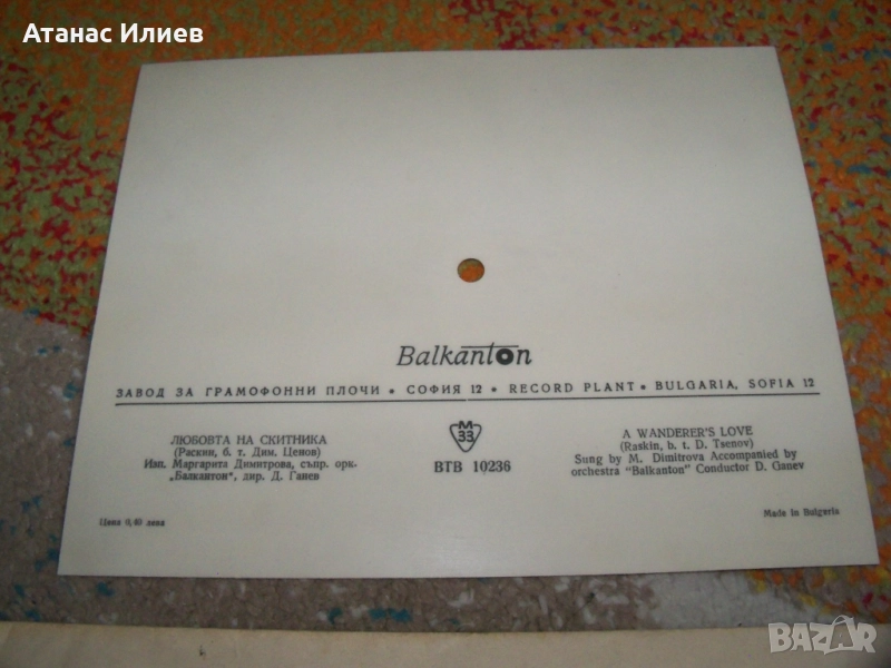Фонокартичка грамофонна плоча Балкантон с оригинален плик. Картичката е с песента "Любовта на скитника" в изпълнение на Маргарита Димитрова. ВТВ10236 Картичката е прослушана и е в отлично състояние.