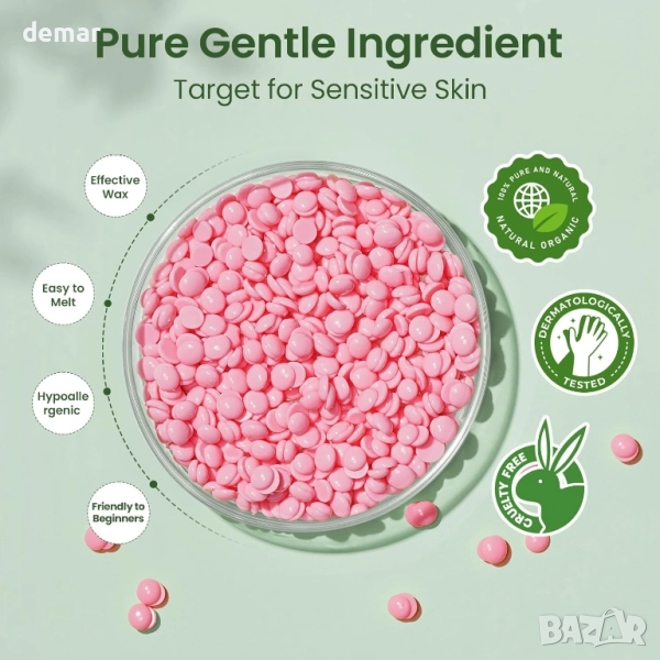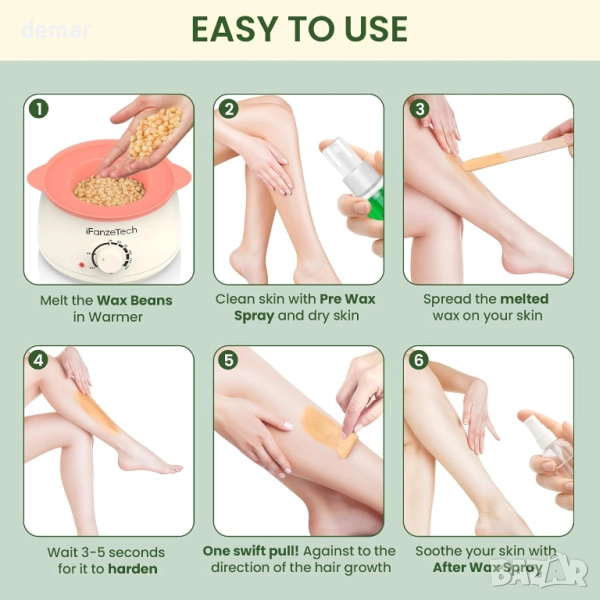 Този комплект за твърда кола маска „всичко в едно“ осигурява всичко необходимо за домашна епилация, включително бързозагряващ се нагревател за кола маска, восъчни перли, апликатори и ръководство за потребителя. Проектиран да премахва до 98% от нежеланото окосмяване от корена до върха, той работи ефективно върху вежди, лице, бикини зона, бразилска депилация, ръце, крака и други зони, осигурявайки гладки резултати, които траят 4–6 седмици. Кола маската е формулирана с нежни към кожата съставки, за да бъде нежна към чувствителната кожа, предлагайки по-малко болезнено изживяване. С технология за бързо и равномерно нагряване, той осигурява кола маска с качество на салон у дома, без разходите или неудобствата от посещенията в салона.