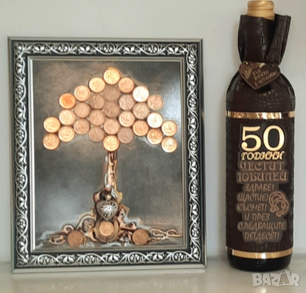 Авторска картина Дървото на живота с истински монети /стотинки/ - комплект с бутилка декорирана с кожа във формата на торбичка и дървена плочка със златни цифри 50 години, и пожелание "Здраве, щастие, късмет и през следващите петдесет".