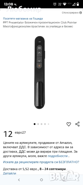 [AAA батерия]: Дистанционното устройство за презентации не е необходимо да се зарежда. При употреба е необходимо да се постави само една AAA батерия, което е много удобно за смяна.