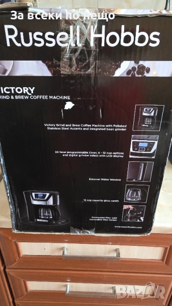 Продавам чисто нова кафе машина на Russell Hobbs. и прави уникално кафе за ценители. Кафе машината е маркова, със стъклена кана. Тази кафе машина мели кафето на едро и финно. Има тих режим на работа. Модела е 22000-56, 1025 W, 1,25 л, 12 чашки кафе. Мелачка със дигитален контрол. Черна и сребриста.