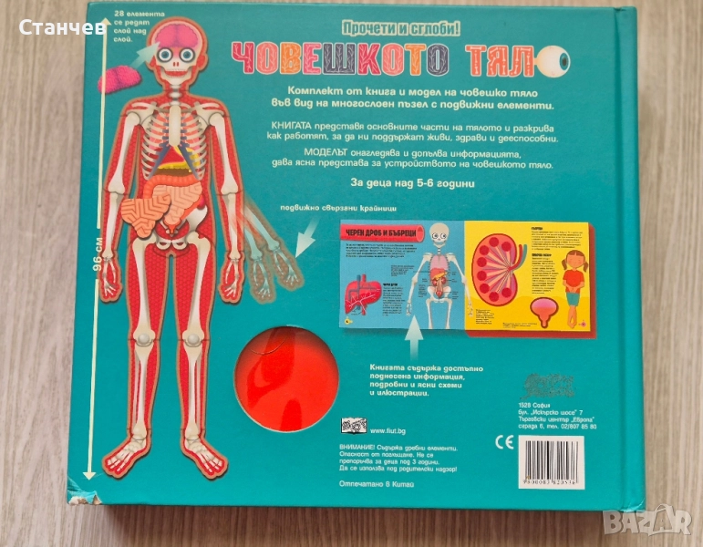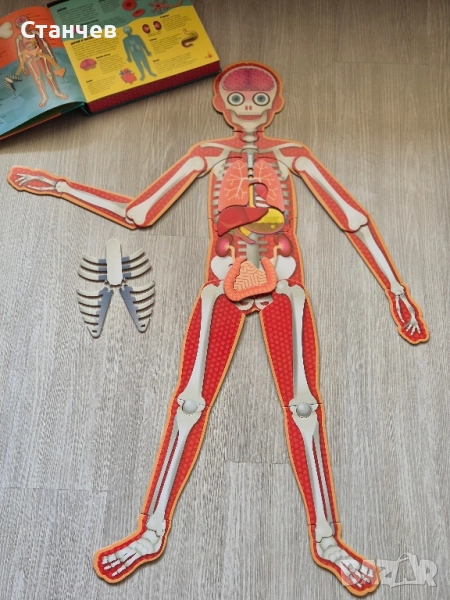 Комплект от книга и модел на човешко тяло във вид на многослоен пъзел с подвижни елементи. Достъпно поднесена информация, подробни схеми и илюстрации. Забележки единствено измачкан заден ръб на книгата и ребрата на пъзела са скъсани - вижте на последните две снимки.