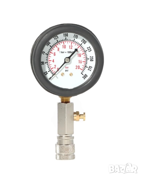 · Прецизно измерване: Манометьр с двойна скала за отчитане в барове [0-20 bar] и PSI [0-300 psi), осигуряващ точни резултати.