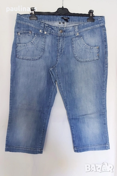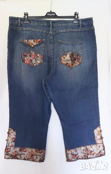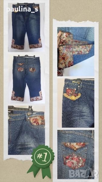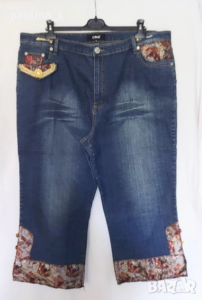 4️⃣. Колаж / 2XL / 4XL - "DNA". Цената е крайна 39,99лв / 20 евро. Дамски дизайнерски дънкови бемуди, изработката и декорацията са безупречни, всичко съобразено с елита на бранда. Платът е доста еластичен. Моделът е "5 pocket Denim" с изразен избелващ ефект на бедрата и около украсителните тегели. Размерът е 52EU, но биха могли да се носят и от съседните. Бранда е популярен с качество и елит. Без дефекти и етикет, нови.