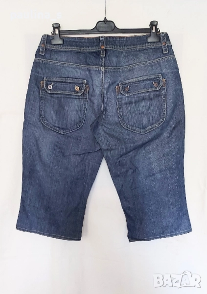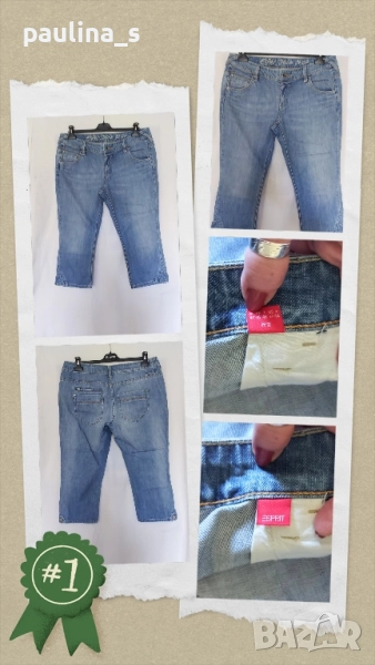 3️⃣. Колаж / L / XL - "Esprit". Цената е крайна 39,99лв / 20 евро. Дамски маркови дънкови бермуди, специфичен модел с коси гайки, отзад има два отворени джоба един имитационенен джоб с цип, на крачолите има допълнителни засечки с копчета. Платът е плътен, Не еластичен Деним, подходящи са и за по-хладно време. По етикет са 42EU, но стават до 44EU, с тесен таз. Като нови са, без дефекти и етикет.