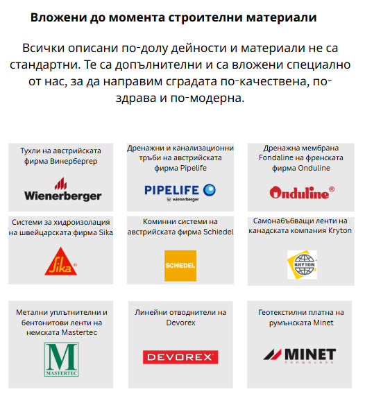 - Само с КАЧЕСТВЕНИ И СКЪПИ МАТЕРИАЛИ - тухли Wienerberger Porotherm Thermo, тръби Pipelife, дренажна мембрана на Onduline, системи за хидроизолация на Sika, коминни системи на Schiedel, самонабъбващи ленти Kryton и др., закупени и вложени до момента.