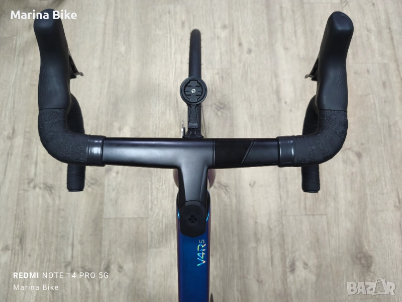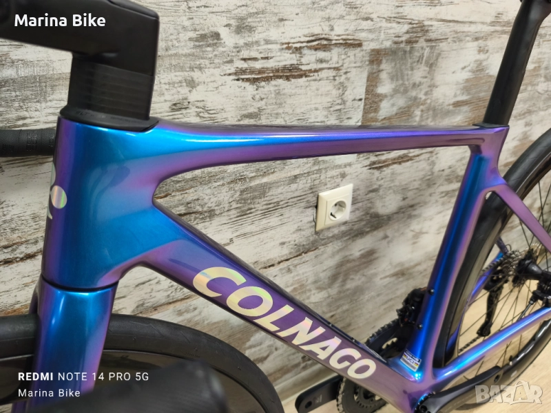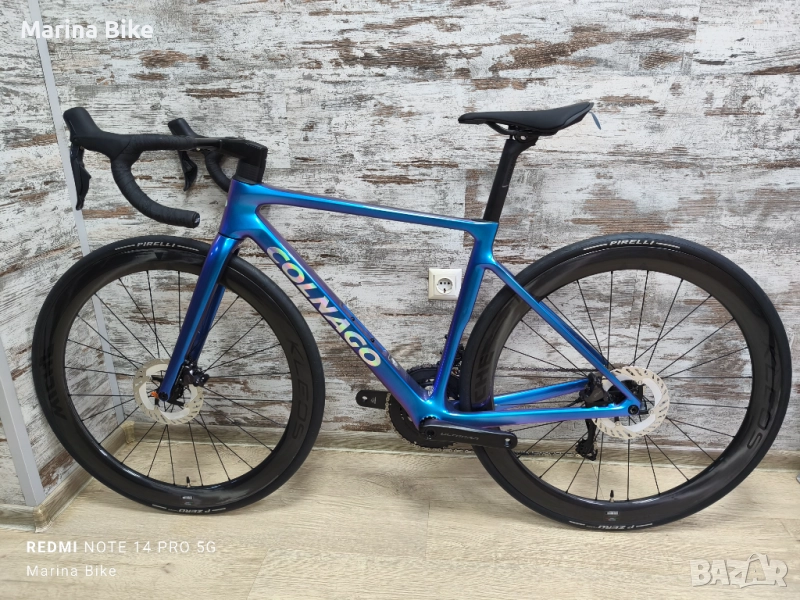 шосеен велосипед Colnago V4RS Disc, модел 2025 година, размер 45.5 (XS), на практика нов. Рамката е мострена, без да е използвана, с нищожни следи от съхранение. Оборудвана е с изцяло чисто нови, неизползвани компоненти - пълен електронен монтаж 2х12 скорости Shimano Ultegra R8170 Di2 с хидравлични дискови спирачки, карбонови клинчър капли Miche Kleos 50, карбонов интегриран кормилен модул Colnago CC.01 и карбонова седалка PRO.