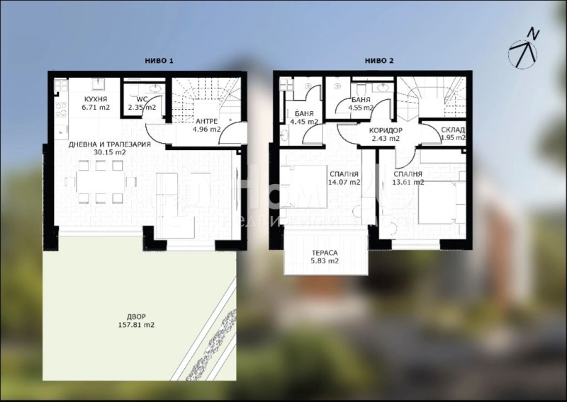 Home2U предлага тристаен мезонет със самостоятелен двор от 157.81 кв.м. На първия етаж са разположени входно антре, дневна зона с кухненски бокс и тоалетна. На втория етаж има две спални, две бани с тоалетни и тераса. Дневната зона е с високи френски прозорци, които осигуряват естествена светлина. Жилището е с изградена система за подово отопление и термопомпа.