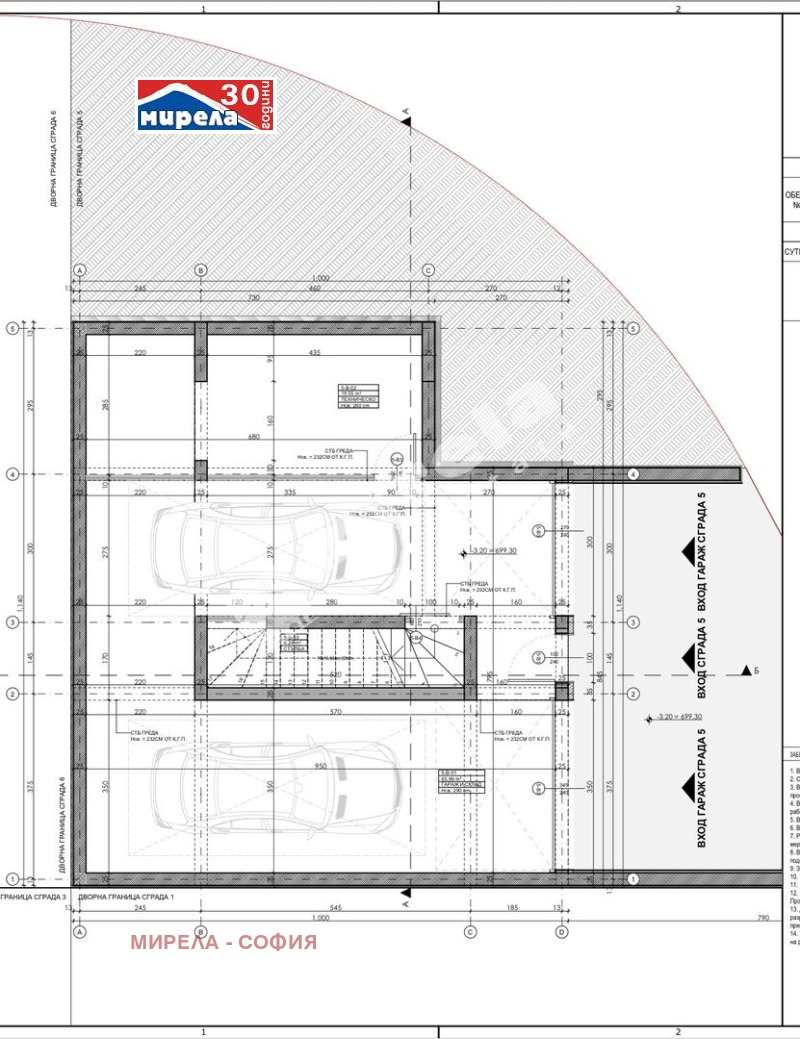* Ниво сутерен със застроена площ 106.03 кв. м, антре, гараж за два автомобила и склад, техническо помещение и стълбище.