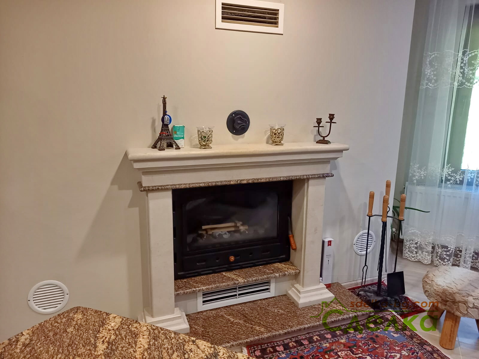 Термопомпа, климатик на първи етаж, камина с въздуховоди на втори етаж.
