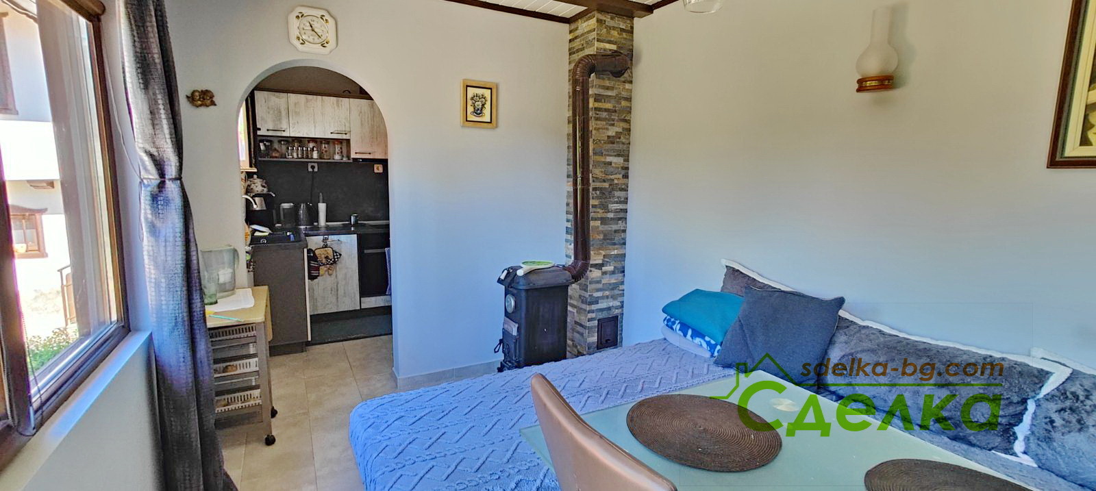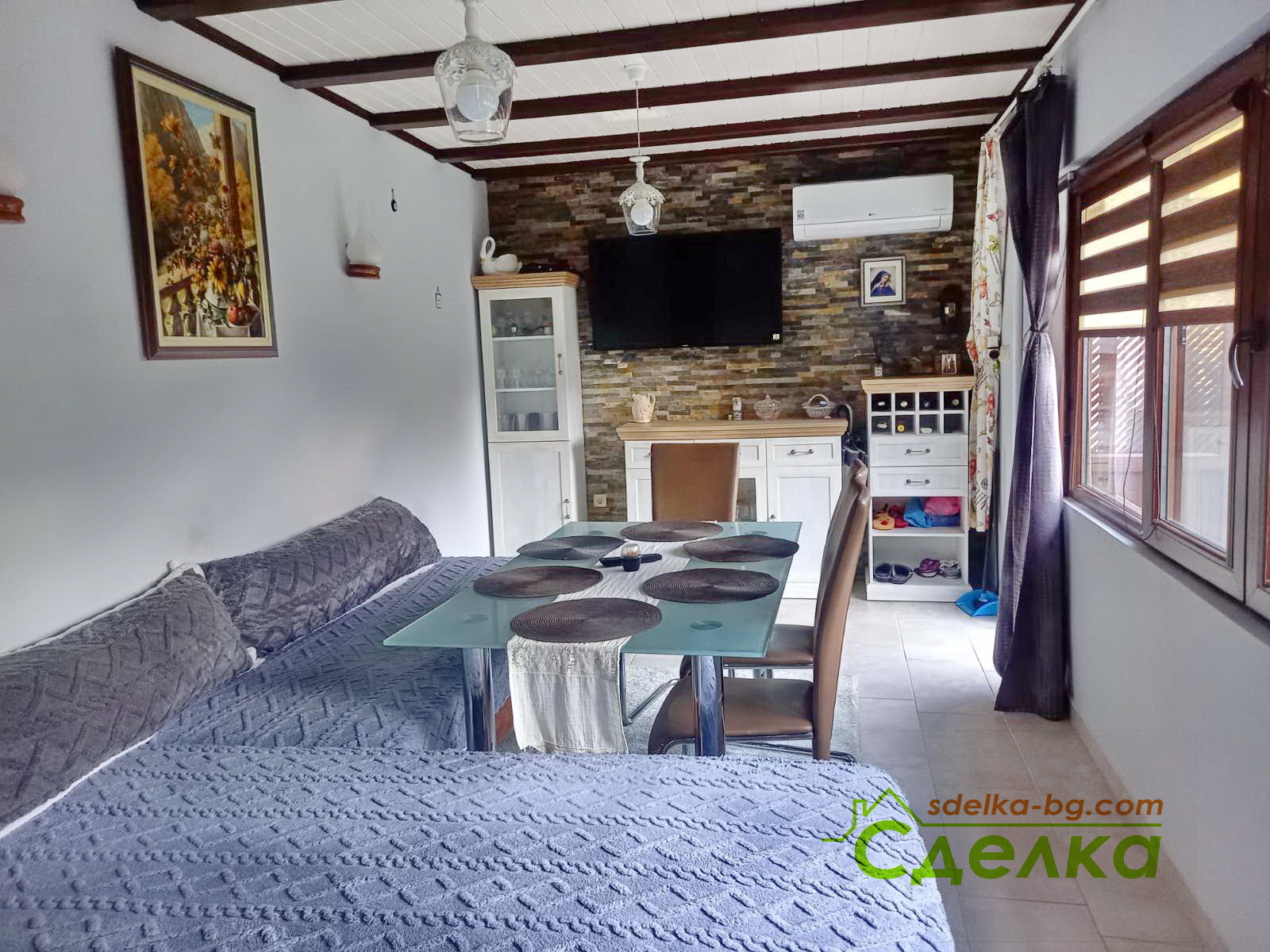 Лятна кухня (30 кв.м.): просторна дневна с климатик и печка на дърва.