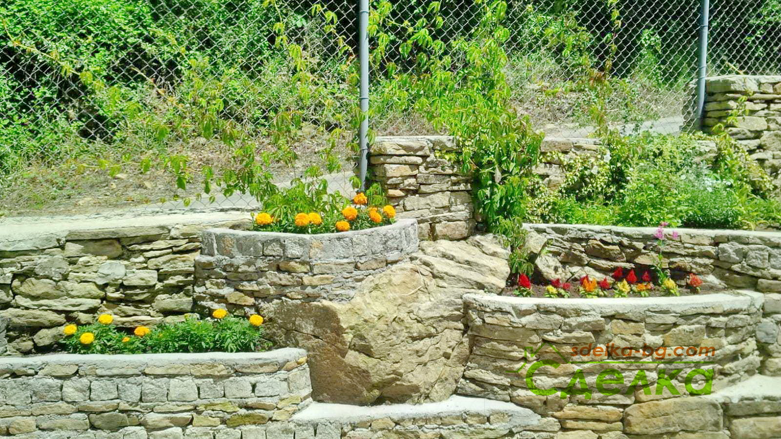 Място за отдих с люлка, цветни алеи и зеленина.
