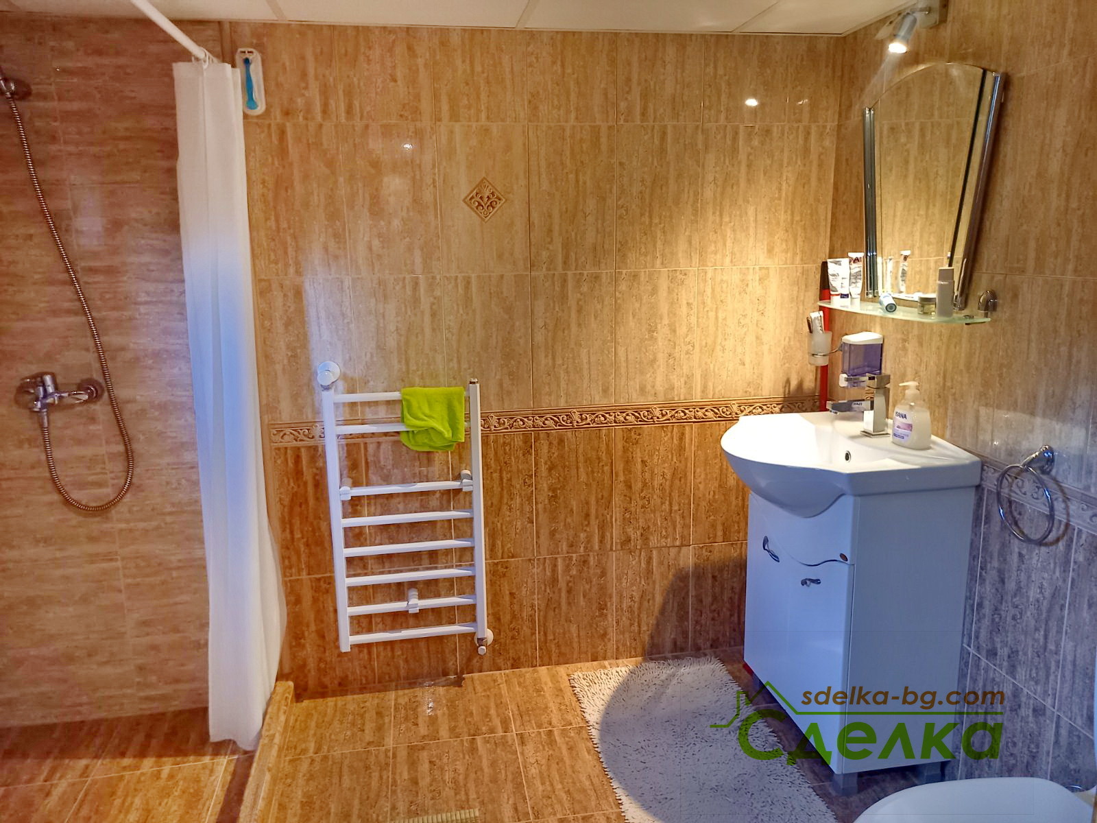 Първи етаж (77 кв.м.): две спални, дневна, кухня, баня с тоалетна.