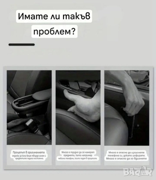 Удобен аксесоар от две части с джобове за съхранение ,който се поставя между двете предни седалки за запълване на пространството там , от еластичен материал в черен цвят/вижте снимките/ . Разгледайте и другите ми обяви за парфюми техника и Ала-бала 🙂