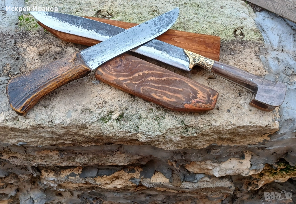 Ножа е НОВ!!! Изработен е от ресьорна стомана, месингов обков, дървени чирени и дървена кания. Много здрав нож. На последните две снимки са с друг нож с чирени от еленов рог, комлекта е 165 евро.