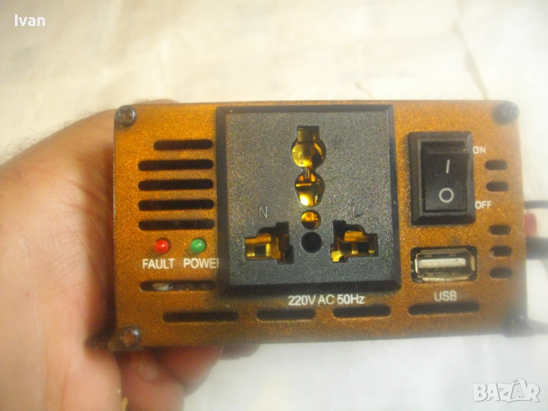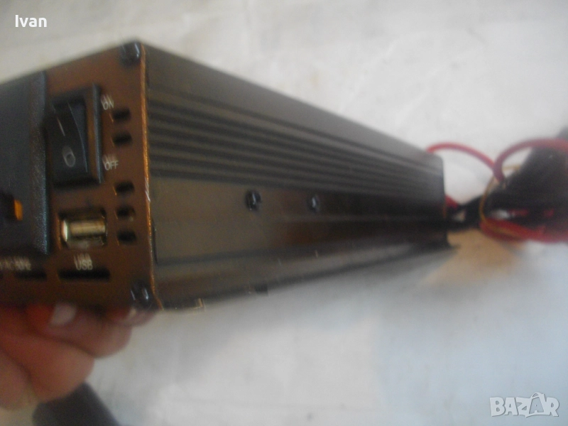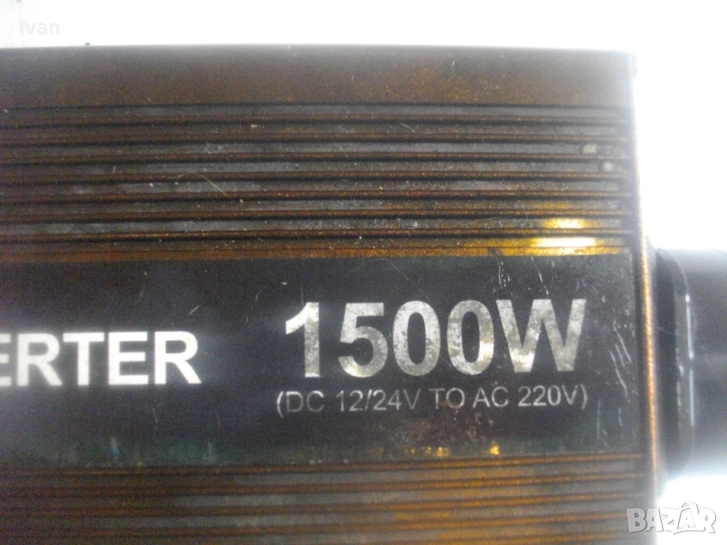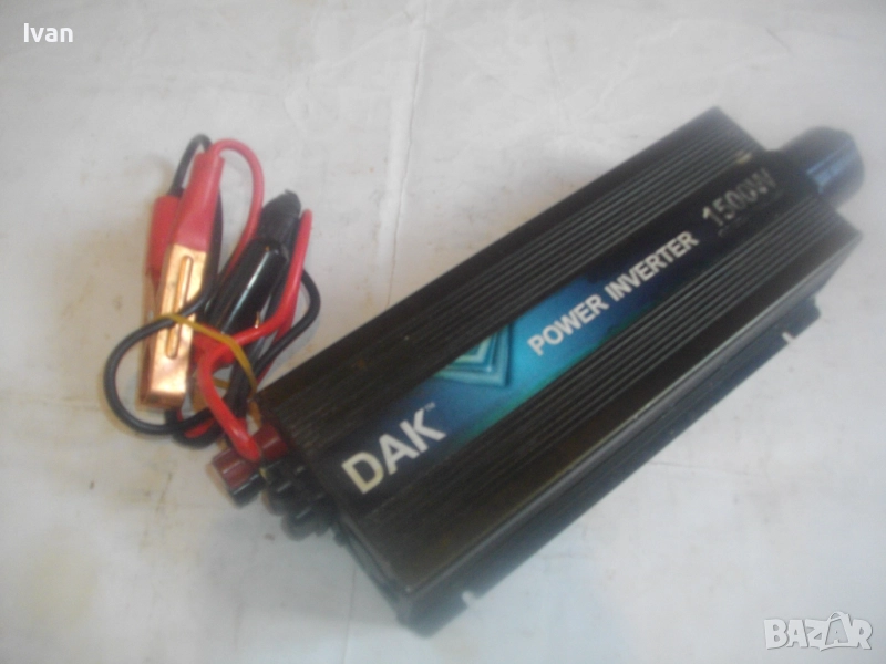 Марка/модел/маркировки - DAK 12V/24V - 220V Power Invertor 1500W DC 12/24V To AC 220V. Уреда е почти нов, с много запазен външен вид и работно състояние - не светва и не работи. Предполагам е претоварен с повече от допустимо максимално натоварване от 1500 вата. 2 светлинни индикации, извод USB стандартно 2,0. Алуминиев корпус от дуралуминий. Звукова сигнализация. Контакт английски оригинален с щепсел адаптер преобразувател евростандарт.Изводи кабели щипки 2 броя за захранване към акумулатор, извод кабел за захранване от запалката на автомобил.