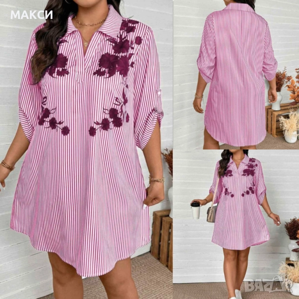 Макси приказна дълга туника/ рокля със скъсяващи се 3/4 ръкав, извивки и модерно V-образно деколте в бяло-розово райе с красива флорална щампа Бохо стил- Топ артикул