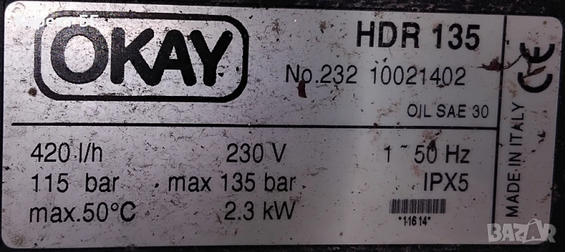 Продавам водоструйка OKAY HDR 135 Марка/Модел: OKAY HDR 135 Дебит: 420 л/ч Работно налягане: 115 bar (макс. 135 bar) Мощност: 2.3 kW Захранване: 230V / 50Hz Максимална температура на входящата вода: 50°C Клас защита: IPX5 Произведена в Италия Работи с масло SAE 30 Състояние: Ползвана, но в добро техническо състояние. Подходяща за почистване на автомобили, дворове, машини и др. Желателно е лично предаване!