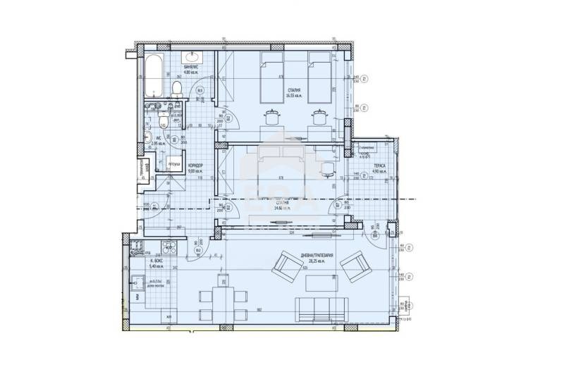 Апартаментът е с чиста жилищна площ от 98,85 кв.м., с източно изложение и функционално разпределение: