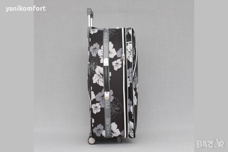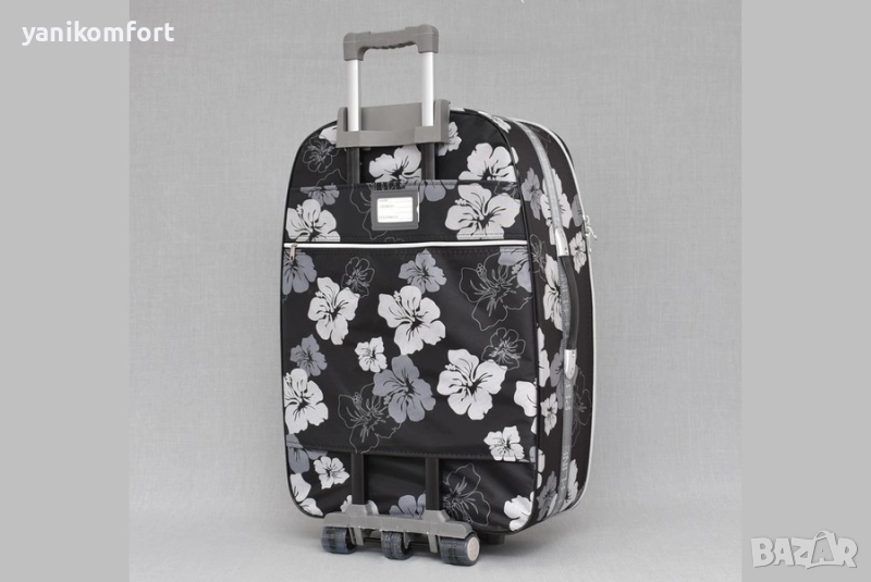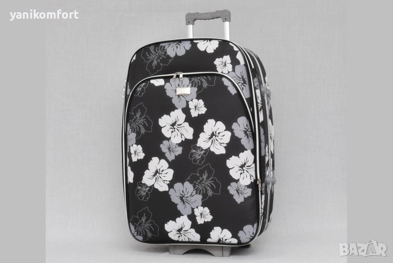 куфар от текстил модел 1518, цветен и красив с разширение. Куфарът се заключва с шифър. Има телескопична, регулираща дръжка на 2 степени и 3 колела. С две дръжки за вертикално и хоризонтално носене, 4 крачета за поставяне в хоризонтално положение. Куфарът има голям лицев джоб, на гърба има джоб с цип и място за поставяне на име и адрес. Вътре е с отделение за багаж с ластични презрамки, джоб за аксесоари и малък джоб с цип. Размери: 28" - 77 х 51 х 29 см 3,35 кг