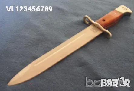 Много добър нож. Има всички стандартни елементи на класически щик - подпружинен бутон, канал в ръкохватка, (закрепване), напречници, канал по острието и др.