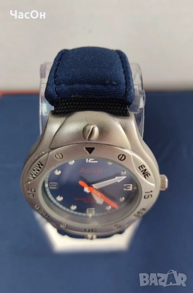 Красив, спортен свеж на вид ASCOT Design. Нов, неизползван, с лепенка на капака. Японски кварцов механизъм MYIOTA. Нова батерия. Ефектен син циферблат на вълни, със сребристи светещи стрелки и маркери, съчетаващи точки и арабски цифри. Ефектна и забележима ярко оранжева секундна стрелка. Стабилен, масивен корпус, капак от инокс.