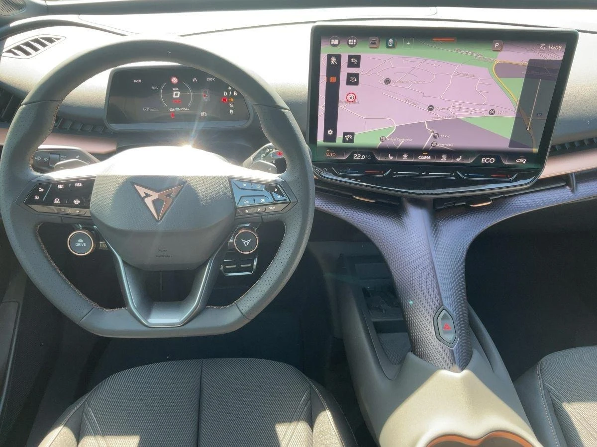 електромобил Акумулаторна батерия с капацитет 82 kWh (брутно) / 77 kWh (нето) Пакети и оборудване Cupra Drive Profile избор на профил на шофиране Cupra Connect Plus мобилни онлайн услуги Асистиращи системи Адаптивно окачване (DCC) Адаптивен круиз контрол с предиктивна функция (ACC/PCC) Интелигентен паркинг асистент с функция за обучено паркиране Дистанционно паркиране (Remote Parking Assistant) Асистент за поддържане на лентата Plus с Travel Assist, Emergency Assist и асистент в трафик Асистент за мъртва точка и излизане от паркомясто, включително предупреждение при отваряне на врата Преден асистент (Front Assist) с функция за аварийно спиране в града Разпознаване на пътни знаци Асистент за разпознаване на умора Автоматично включване на къси/дълги светлини (светлинен и дъждовен сензор) Предварителна подготовка при евентуален удар (Pre-Crash система) Електрическа ръчна спирачка с Auto-Hold функция Система за наблюдение на налягането в гумите Камера за заден ход Комфорт Електрически стъкла отпред и отзад с комфортна функция 3-зонен автоматичен климатроник (Climatronic) Кожен отопляем спортен волан CUPRA Supersport с мултифункция и пера за превключване Височинно регулируема седалка за водача Спортни седалки тип шел с интегрирани подглавници Делима задна облегалка (1/3 2/3) Задна и предна централна подлакътници Електрически отваряща се и затваряща се задна врата (сензорно управление) Индуктивно зарядно за смартфони LED интериорно осветление LED осветление на багажното отделение Регулируеми по височина предни колани Вътрешно огледало с автоматично затъмнение Слънчев визьор с огледало и осветление Осветление и видимост Matrix LED фарове с LED подпис LED дневни светлини Задни LED светлини с непрекъсната светлинна лента (Infinite Light) Светлинен и дъждовен сензор Електрически сгъваеми, отопляеми и регулируеми външни огледала с функция Welcome Light и памет Прибавено светлинно оформление (амбиентно осветление) Затъмнени задни стъкла и задно стъкло (Privacy Glass) Сигурност Фронтални въздушни възглавници за водача и пътника (с възможност за деактивация) Странични въздушни възглавници отпред и централна въздушна възглавница Въздушни възглавници за глава Сигнализация за непоставен колан ISOFIX и i-Size захвати за детски седалки на предната и задната седалка Алармена система с вътрешен сензор и защита от теглене Централно заключване и безключово стартиране (KESSY Advanced) Акустична система за пешеходци (e-sound / AVAS) Електронен имобилайзер Мултимедия и свързаност Навигационна система с 15" цветен тъчскрийн Цифрово радио (DAB+) Full Link (Apple CarPlay, Android Auto, MirrorLink) Bluetooth аудио стрийминг и хендсфри Гласово управление 2x USB Type-C отпред 2x USB Type-C за втора редица Интериор Виртуален кокпит (Digital Cockpit) Тапицерия Soul Black Мултифункционална централна конзола с поставки за чаши, кутия за съхранение и въздушни отвори Декоративни елементи в Copper Черен таван Алуминиеви педали Екстериор Алуминиеви джанти (LM-фелги) Специална боя Atacama Desert Metallic Тъмен хромиран надпис CUPRA на задната врата Подготовка за монтаж на теглич